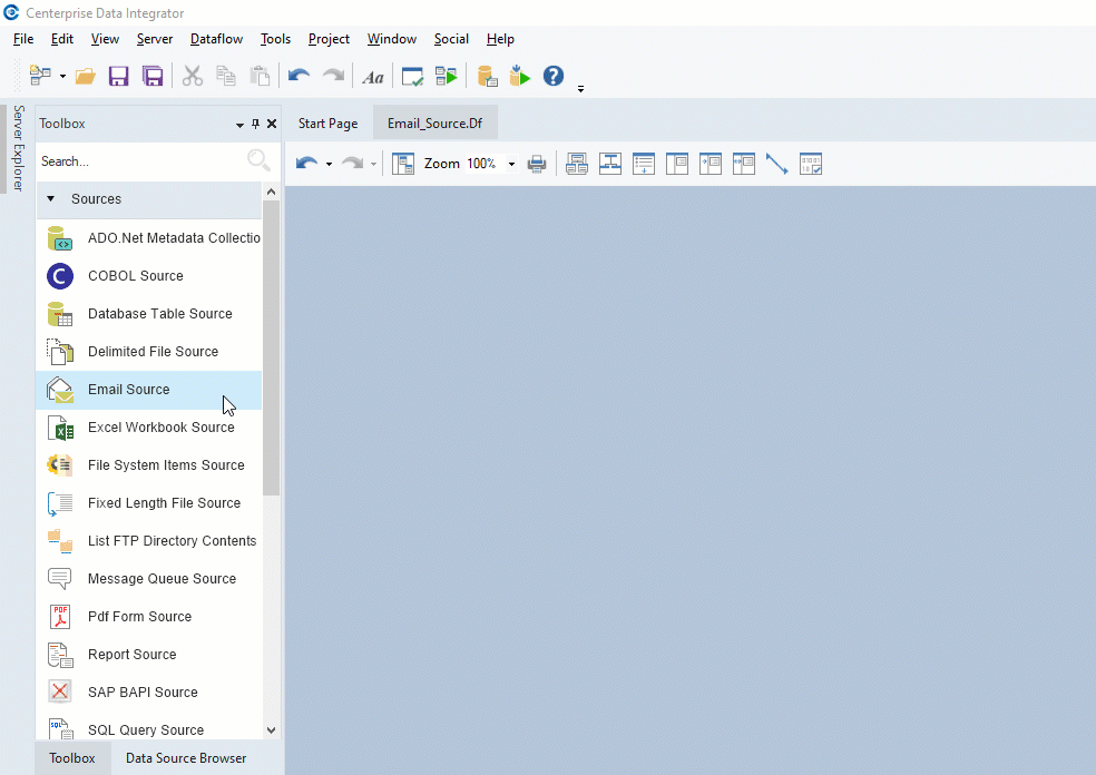 In this section, we will cover how to get the Email Source object onto the dataflow designer from the Toolbox.