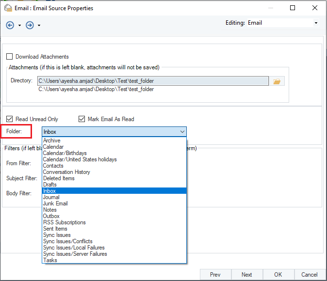Folder – From the drop-down list next to Folder, you can select the specific folder to check, for example, Inbox, Outbox, Sent Items etc.