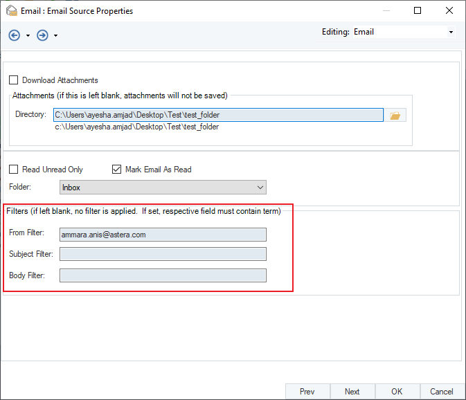 Click Next. This is the Email Source Properties window. There are two important parts in this window: