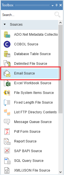 To get an Email Source object from the Toolbox, go to Toolbox > Sources > Email Source. If you are unable to see the Toolbox, go to View > Toolbox or press Ctrl + Alt + X.