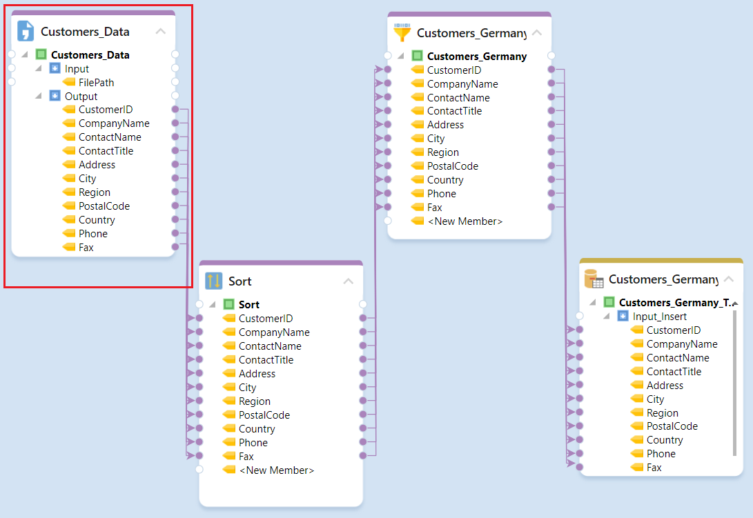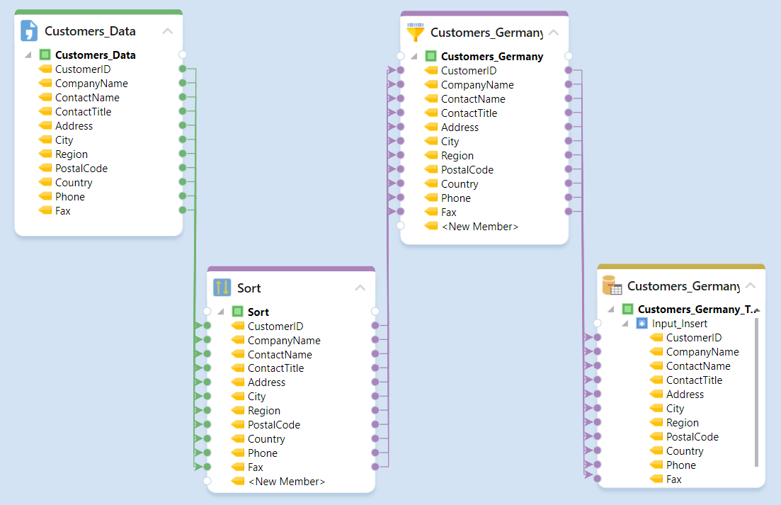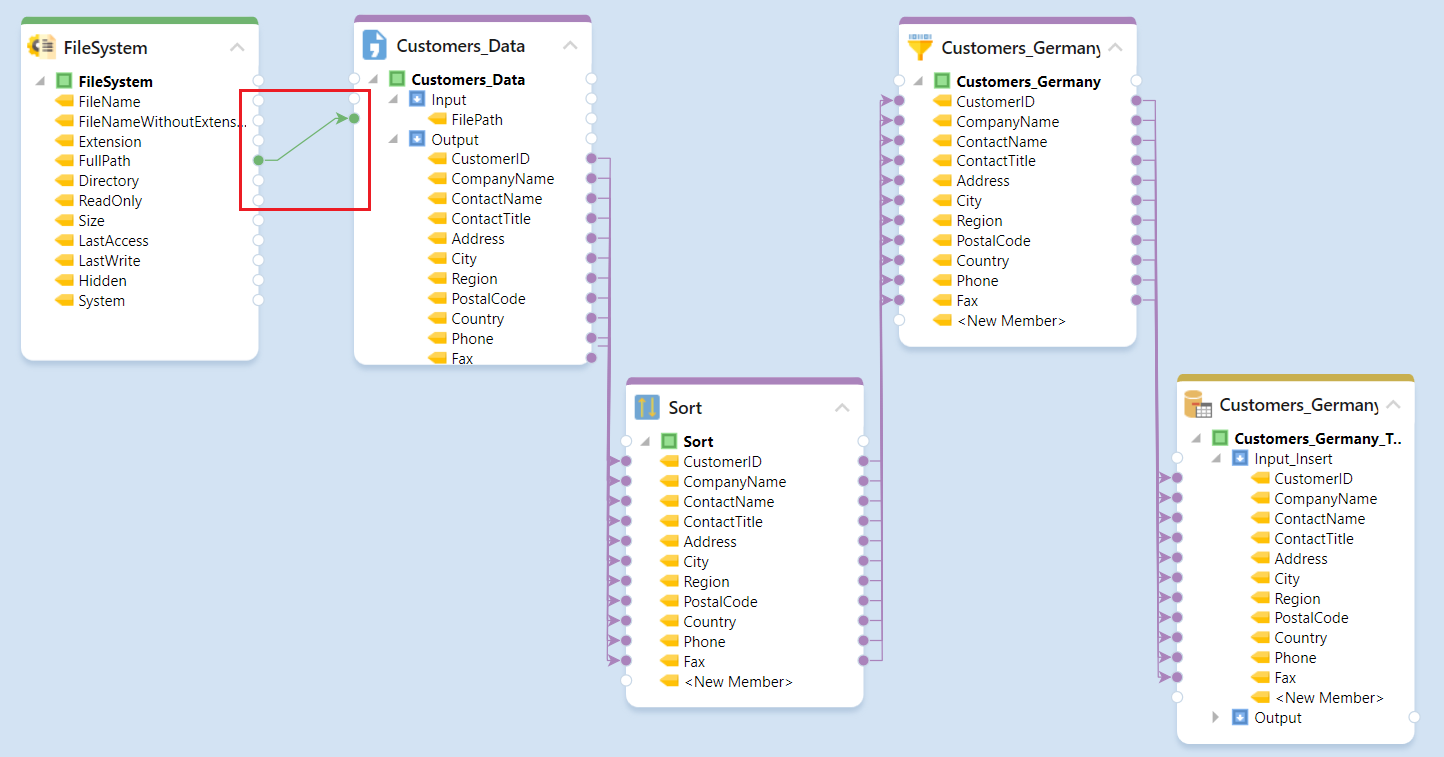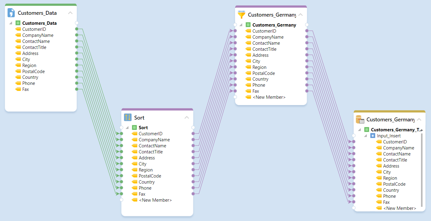 Here, we want to sort the data, filter out records of customers from Germany and write the filtered records into a database table. The source data is stored in delimited (.csv) files.