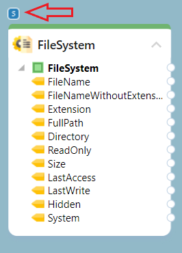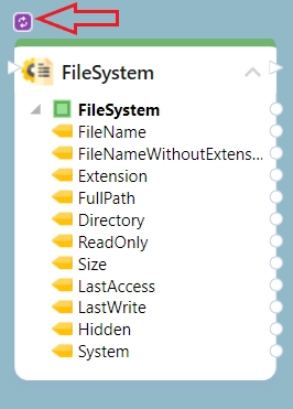 If you look at the File System Items Source, you can see that the layout is pre-populated with fields such as FileName, FileNameWithoutExtension, Extension, FullPAth, Directory, ReadOnly, Size, and other attributes of the files. Also, there is this small blue icon with the letter ‘s’, this indicates that the object is set to run in Singleton mode.