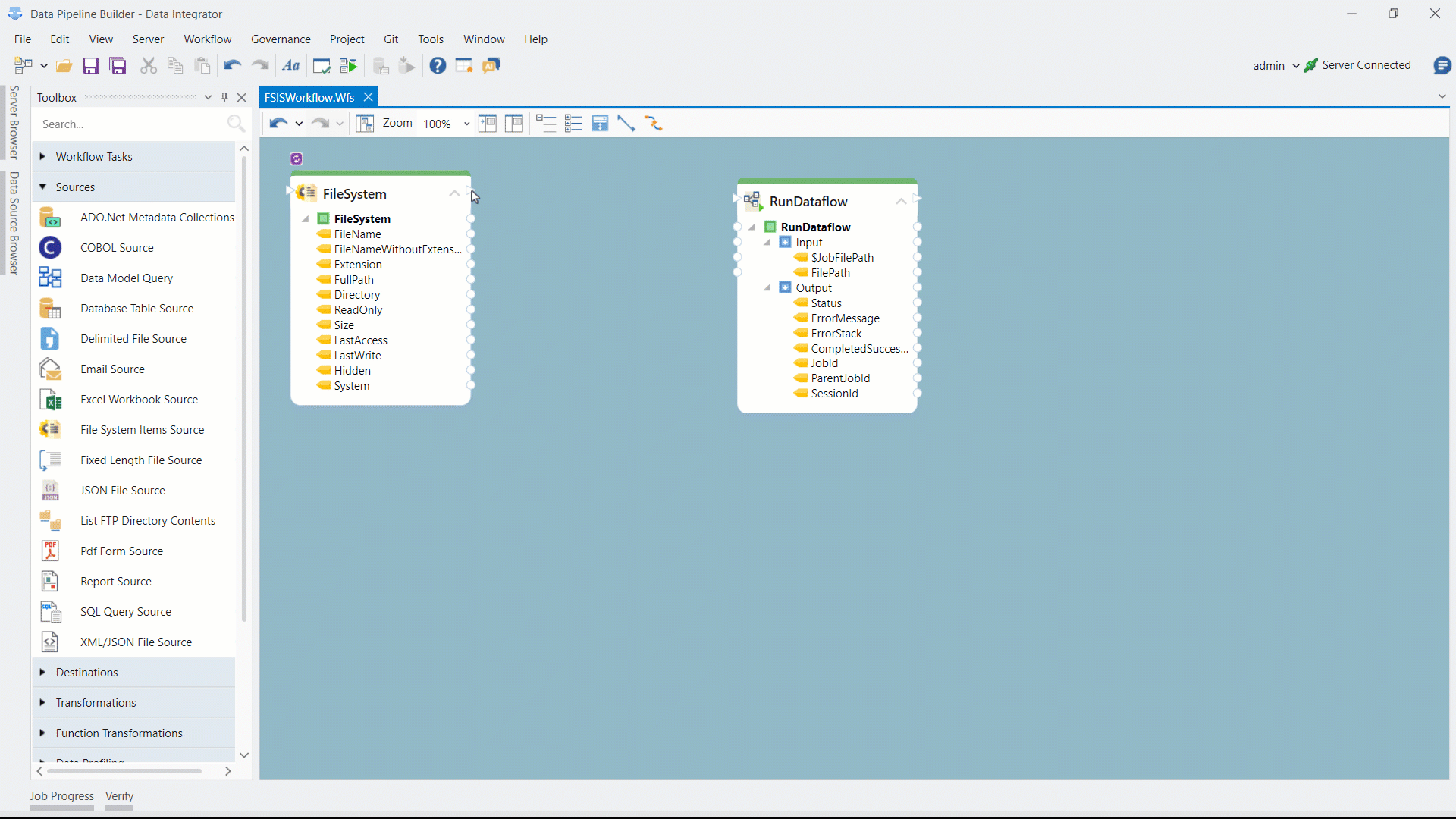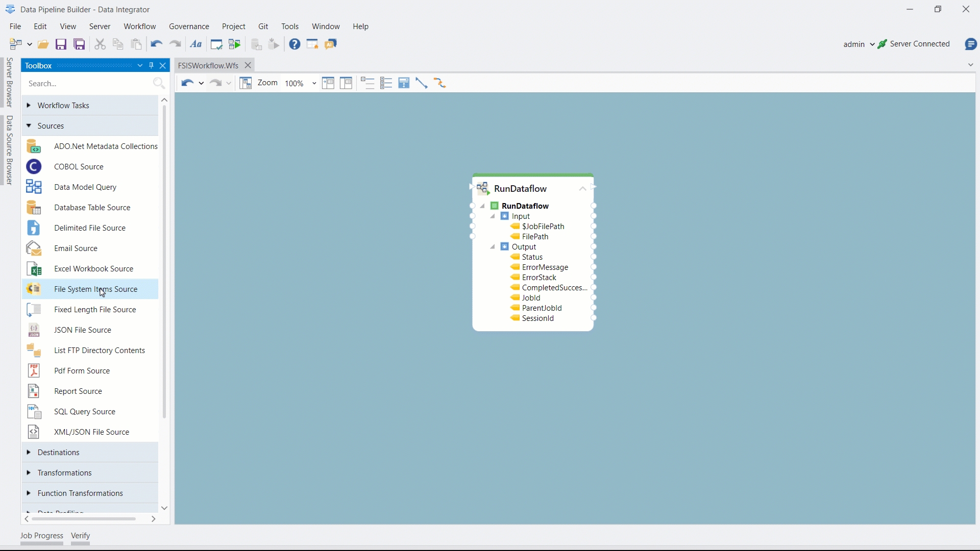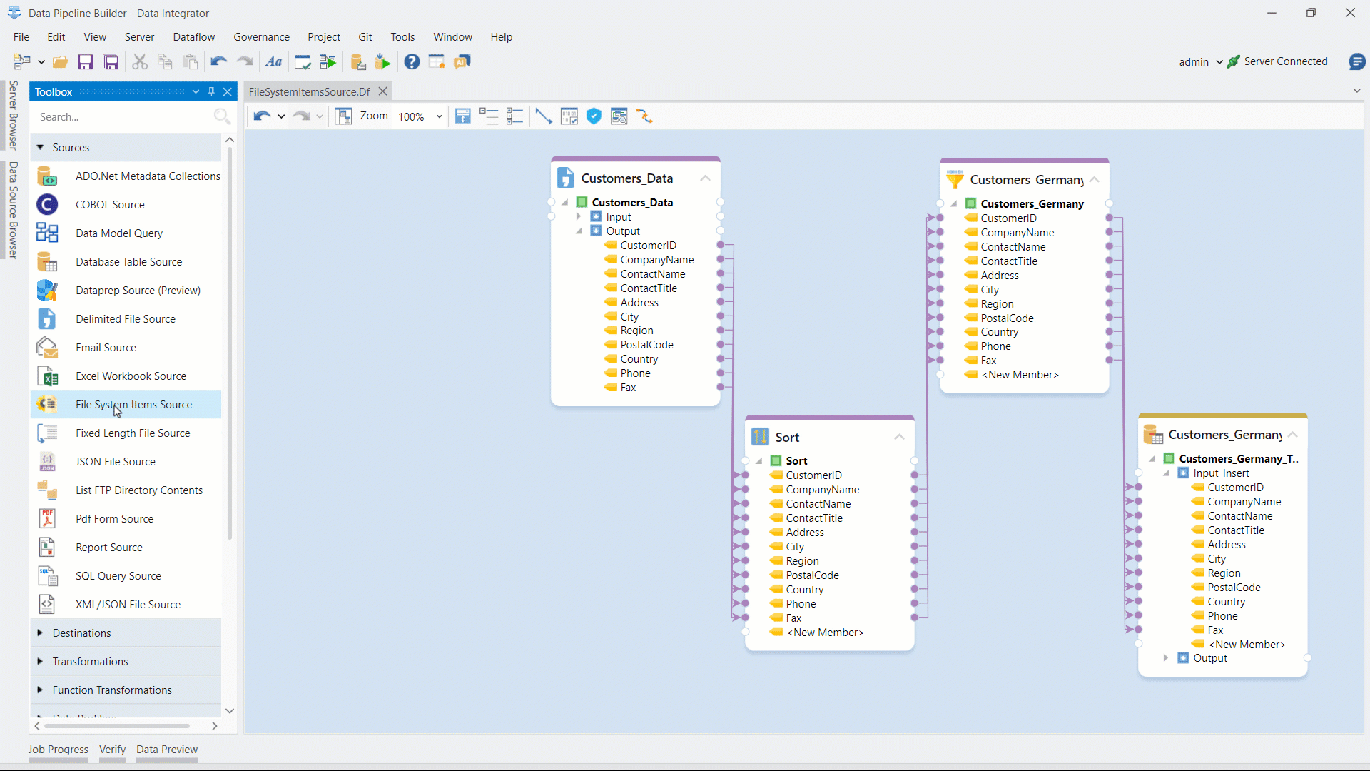 Now we will use a File System Items Source object to provide a path to Customer_Data Transformation object. Go to the Sources section in the Toolbox and drag-and-drop the File System Items Source object onto the designer.