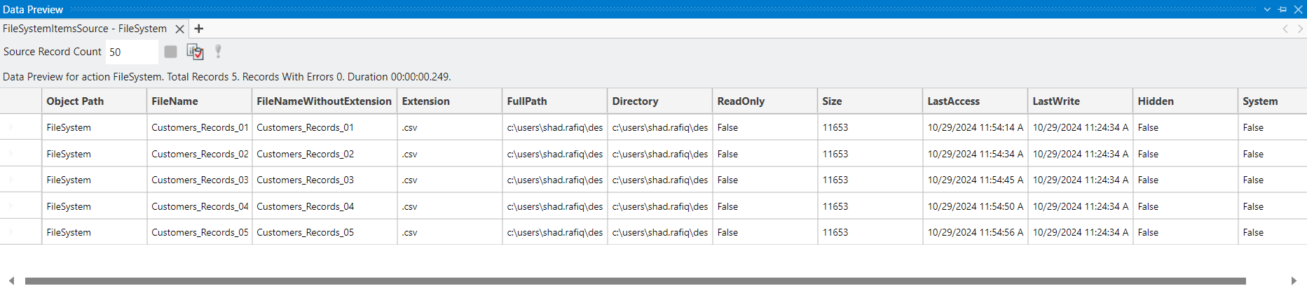 You can see that the File System Items Source object has filtered out delimited files from the specified location and has returned the metadata in the output. You can see the FileName, FileNameWithoutExtension, Extension, FullPath, Directory, and other attributes such as whether the file is ReadOnly, FileSize, LastAccessed, and other details in the output.