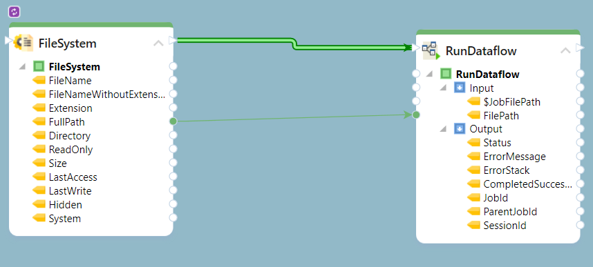 Once mapped, upon running the dataflow, the File System Items Source object will pass the path to the source files, one by one, to the RunDataflow task. In other words, the File System Items Source acts as a driver to provide source files to the RunDataflow tasks, which will then process them in the dataflow.