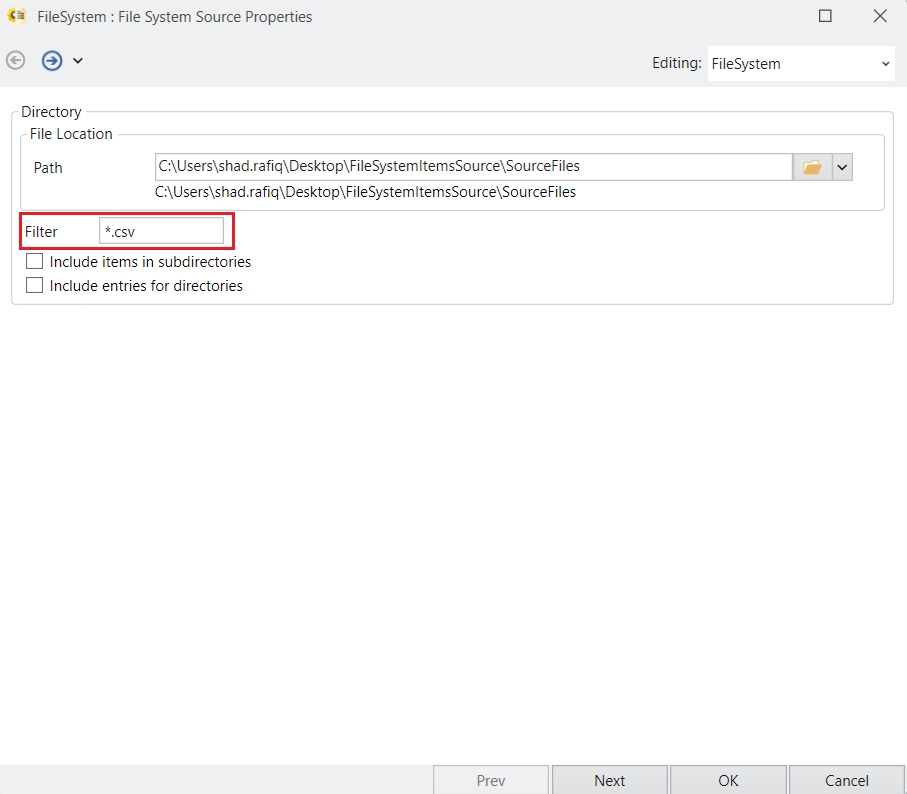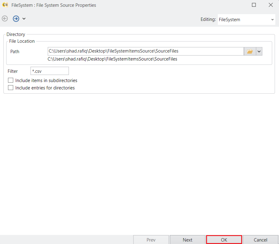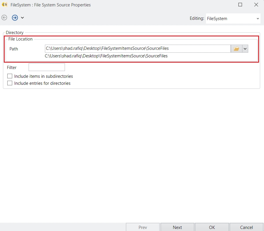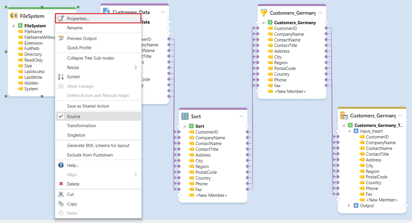 To configure the properties of the File System Items Source object, right-click on the File System Items Source object’s header and go to Properties.