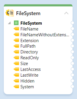 If you look at the File System Items Source object, you can see that the layout is pre-populated with fields such as FileName, FileNameWithoutExtension, Extension, FullPAth, Directory, ReadOnly, Size, and other attributes of the files.