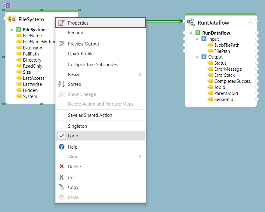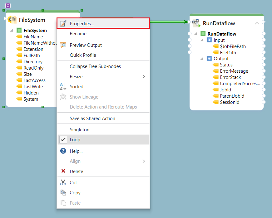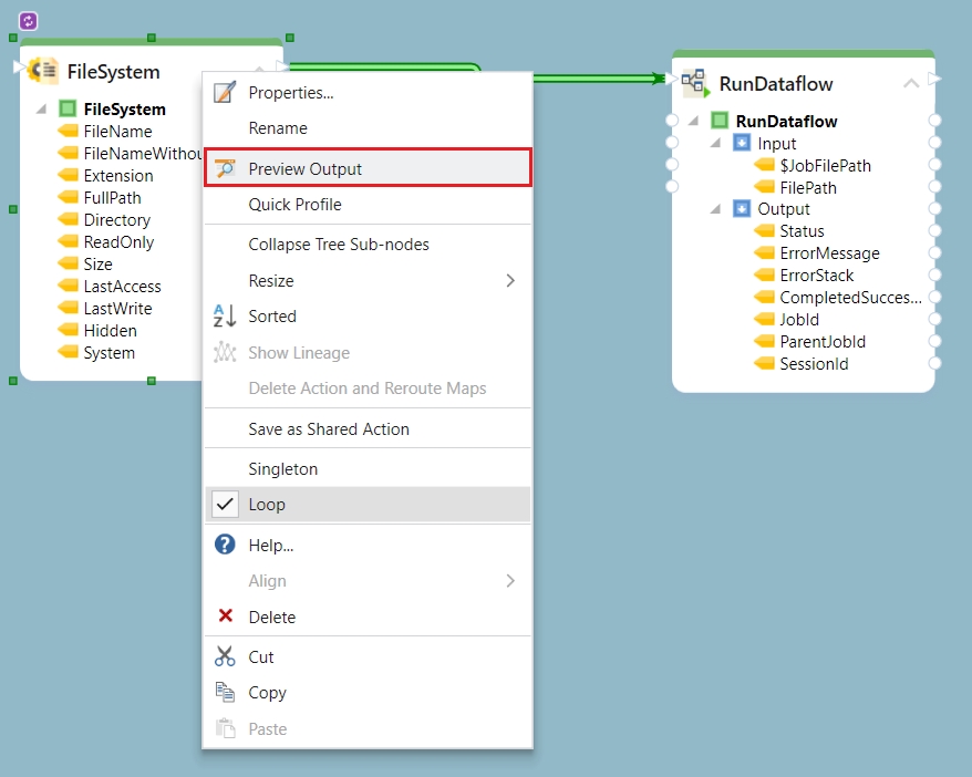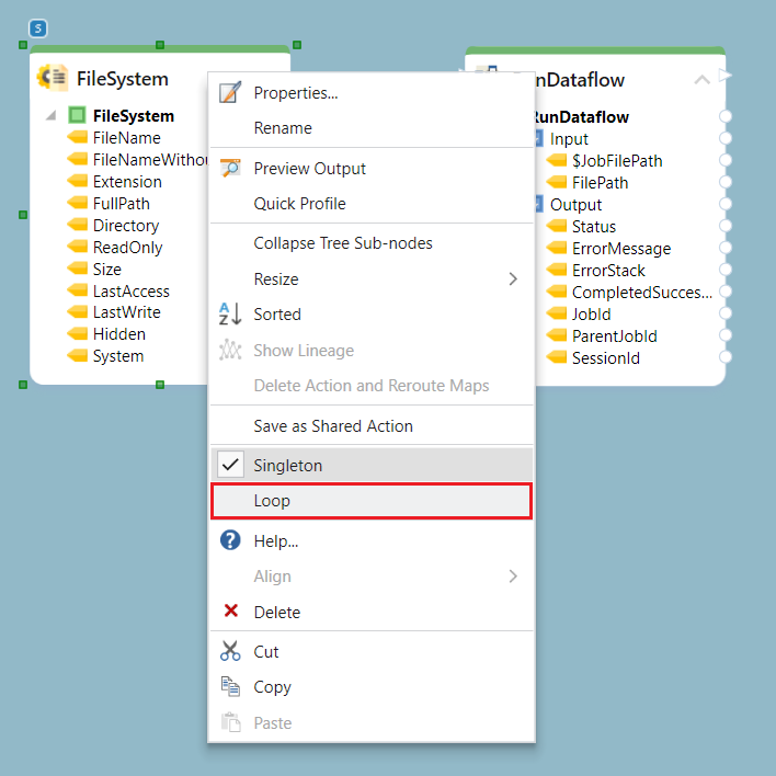By default, all objects in a workflow are set to execute in Singleton mode. However, since we have multiple files to process in the dataflow, we will set the File System Items Source object to run in loop. For this, right-click on the File System Items Source and click Loop in the context menu.