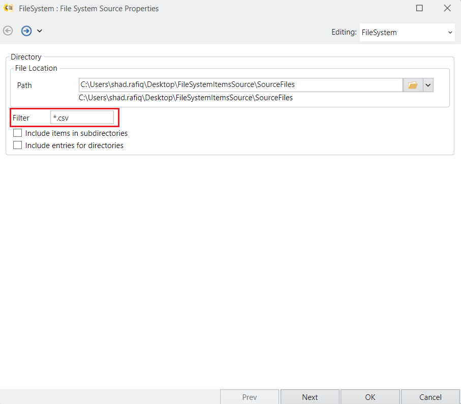Filter: If your specified source location contains multiple files in different formats, you can use this option to filter and read files in the specified format. For instance, our source folder contains multiple PDF, .txt. doc, .xls, and .csv files, so we will write “*.csv” in the Filter field to filter and read delimited files only.
