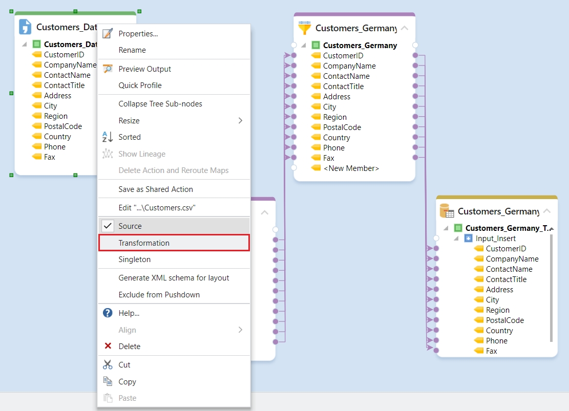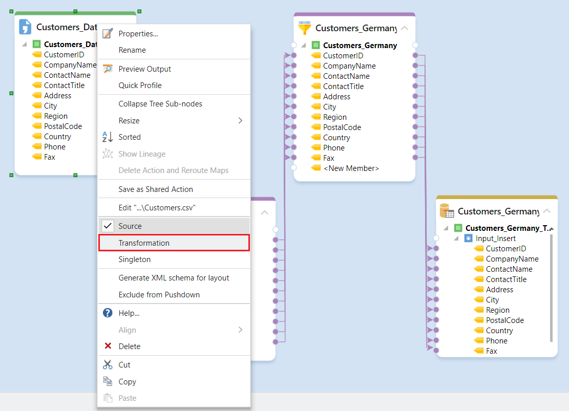 First, change the source object into a Transformation object. This is because the data is stored in multiple delimited files and we want to process all of them in the dataflow. For this, right-click on the source object’s header and click Transformation in the context menu.