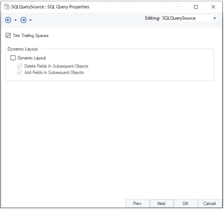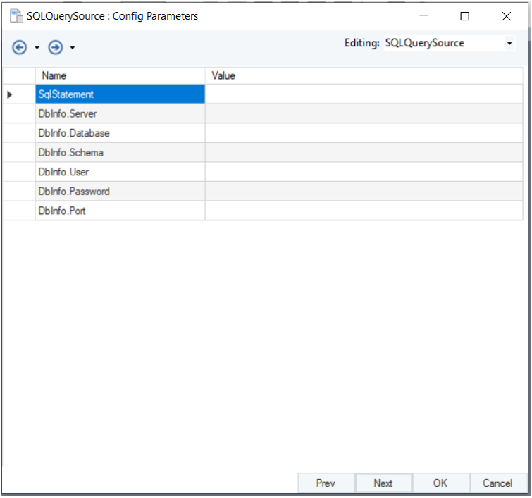 In the Config Parameters window, you can define certain parameters for the SQL Query Source object.