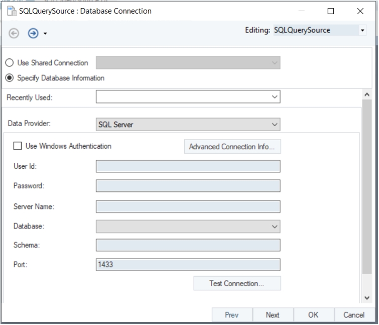 Use the Data Provider drop-down list to specify which database provider you want to connect to. The required credentials will vary according to your chosen provider.