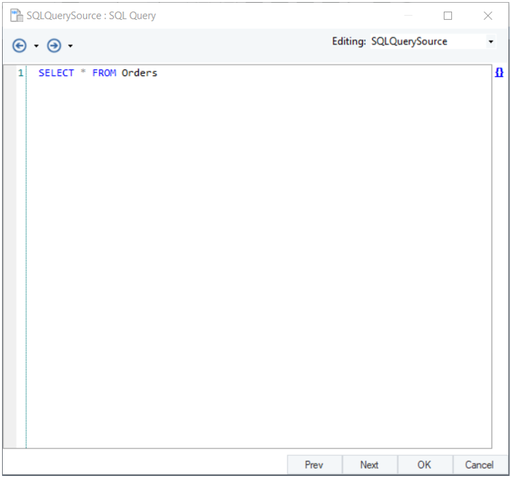 In this window, we will configure properties for the SQL Query Source object.