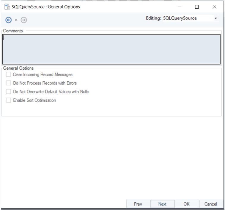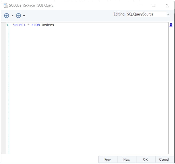 The SQL Query Source object enables you to retrieve data from a database using an SQL query or a stored procedure. You can specify any valid SELECT statement or a stored procedure call as a query. In addition, you can parameterize your queries dynamically, thereby allowing you to change their values at runtime.