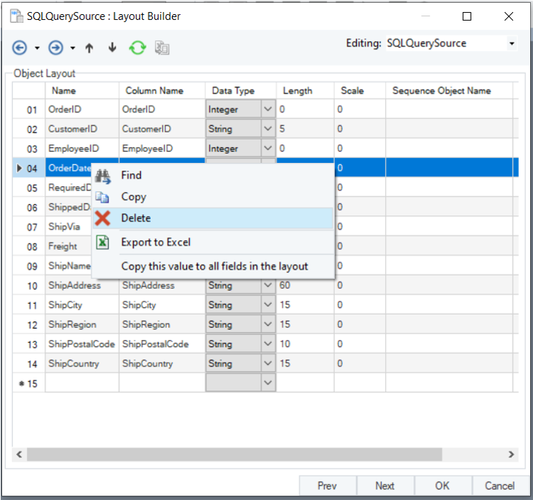 To delete a certain field, right-click on its serial column and select Delete from the context menu. In this example, we have deleted the OrderDate field.