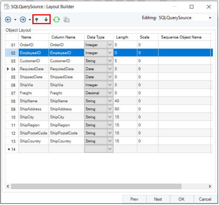 To change the position of a field, click its serial column and use the Move up/Move down icons located in the toolbar of the window. In this example, we have moved up the EmployeeID field using the Move up icon, thus shifting the CustomerID field to the third row. You can move other fields up or down in a similar manner, allowing you to modify the entire order of the fields present in the table.