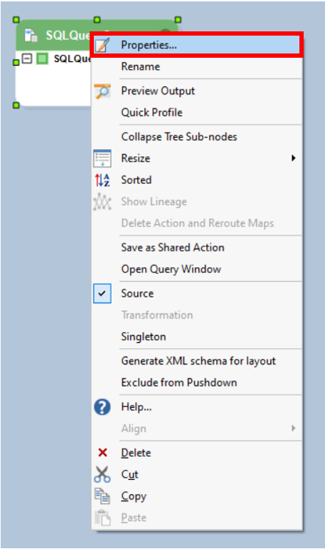 To configure the SQL Query Source object, right-click on its header and select Properties from the context menu. Alternatively, you can double-click the header of the source object.