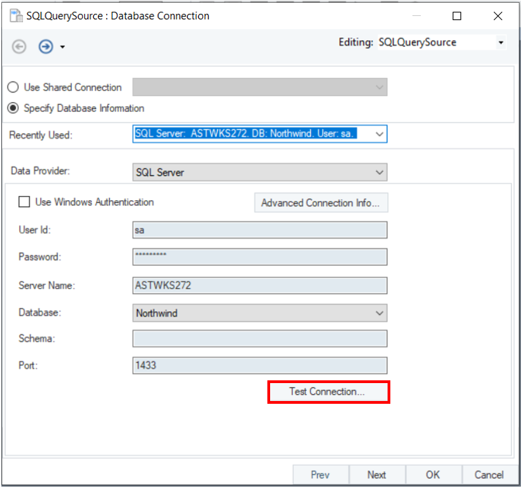 Test Connection to ensure that you have successfully connected to the database. A separate window will appear, showing whether your test was successful. Close this window by clicking OK, and then, click Next.