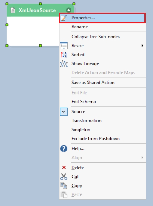 To configure the XML/JSON File Source object, right-click on the header and select Properties from the context menu.