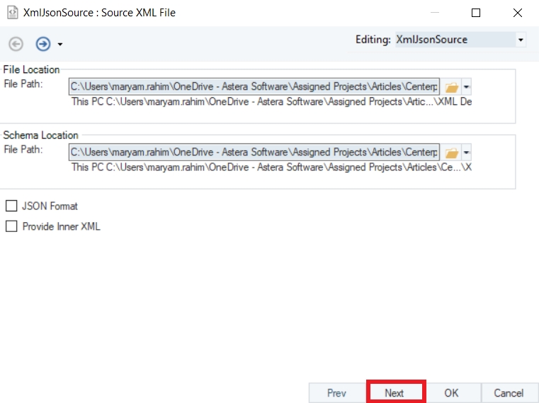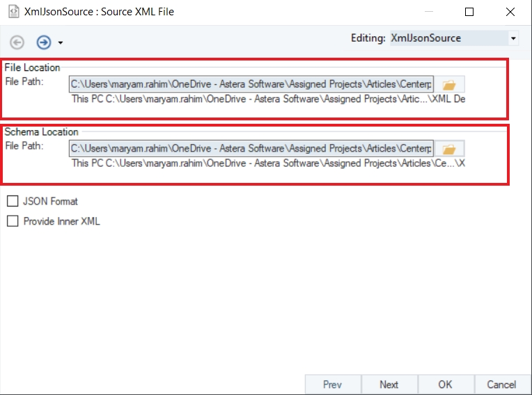 The first step is to provide the File Path and Schema Location for the XML/JSON Source object. By providing the file path and schema, you are building the connectivity to the source dataset.