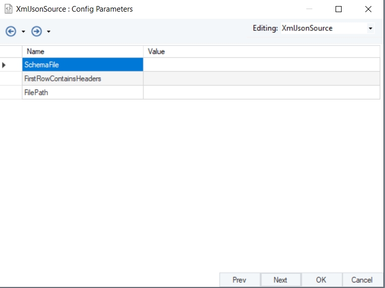 After you are done viewing the layout, click Next. You will be taken to a new window, Config Parameters. Here, you can define the parameters for the XML/JSON File Source.