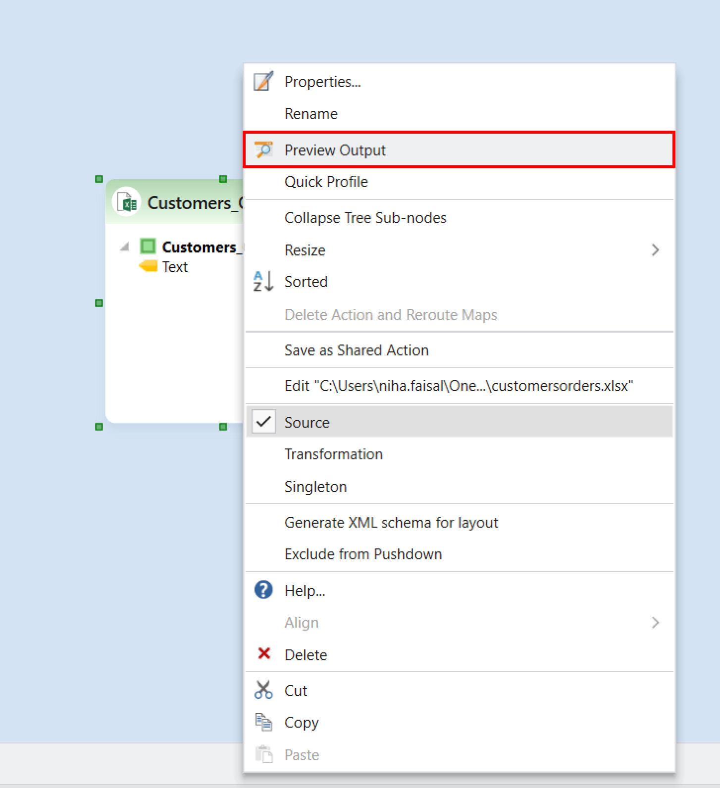To preview data, right-click on the source object’s header and select Preview Output from the context menu.