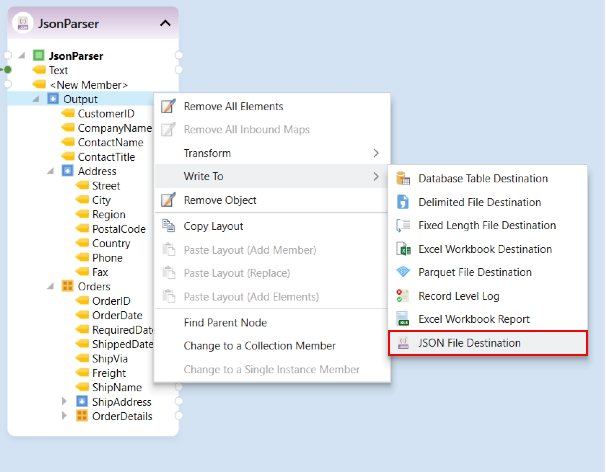 Right-click on the Output node under JSON Parser object, go to Write to > JSON File Destination. A JSON File Destination object is added to the dataflow designer with all fields auto-mapped to it.