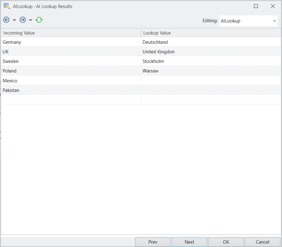 Once configured, click Next. The object will perform an AI call and automatically create a list of the Incoming Value and its corresponding Lookup Value. We can also add or remove any values from this list if needed.