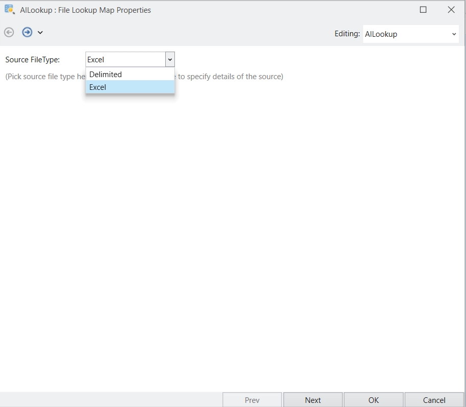 A File Lookup Map Properties window will open where you can see an option for Source File Type. Here, you need to specify the type of your lookup file and click Next.