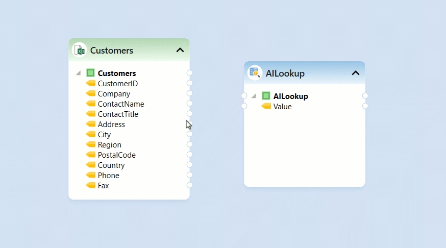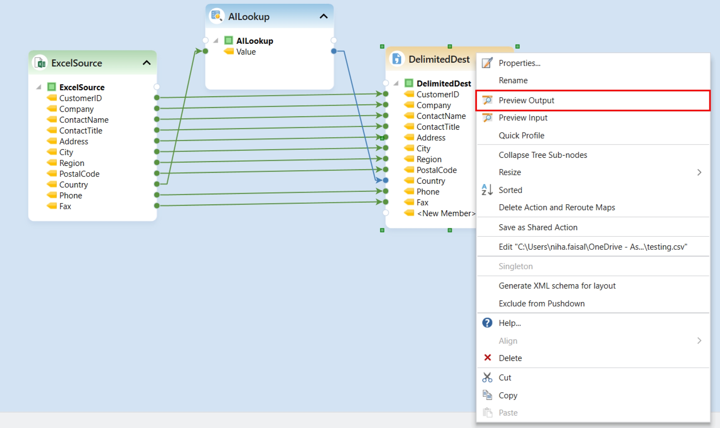 Next, drag-and-drop the AI Lookup object from the Toolbox onto the Dataflow and map the field you want to perform lookup on from the Excel Workbook Source onto the AI Lookup object Value field.