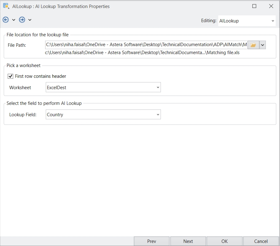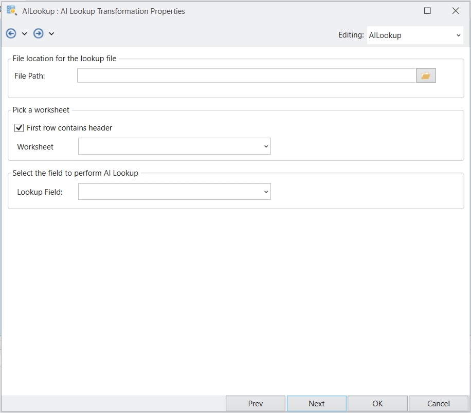 The AILookup Transformation Properties screen will open, let’s configure these properties.