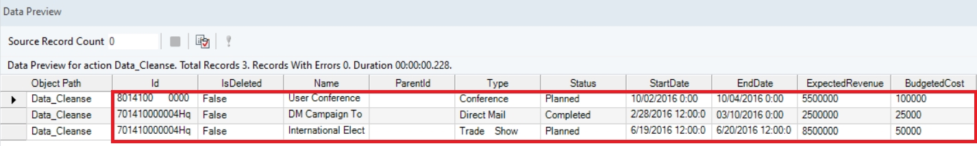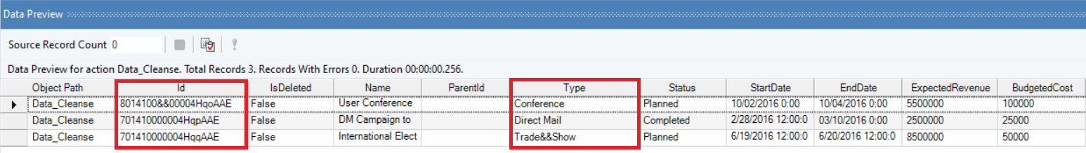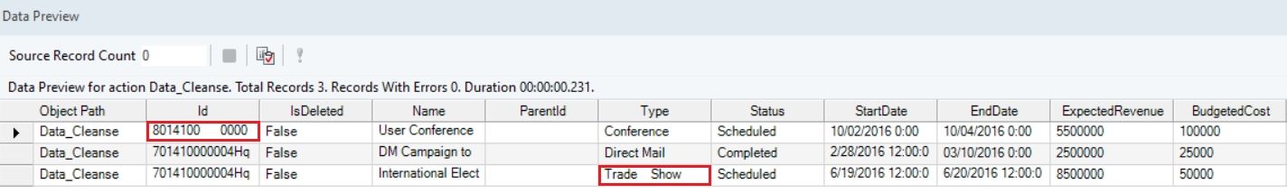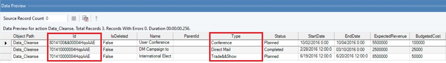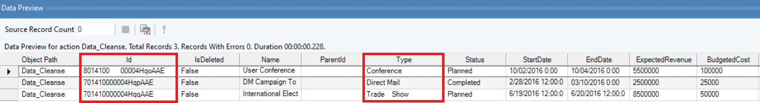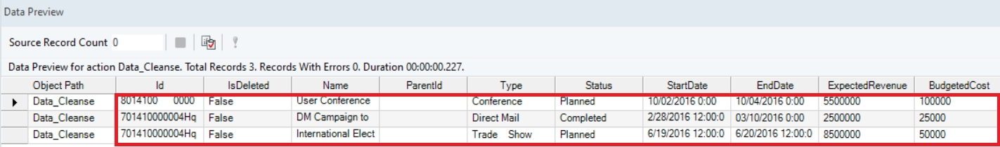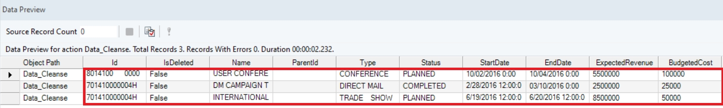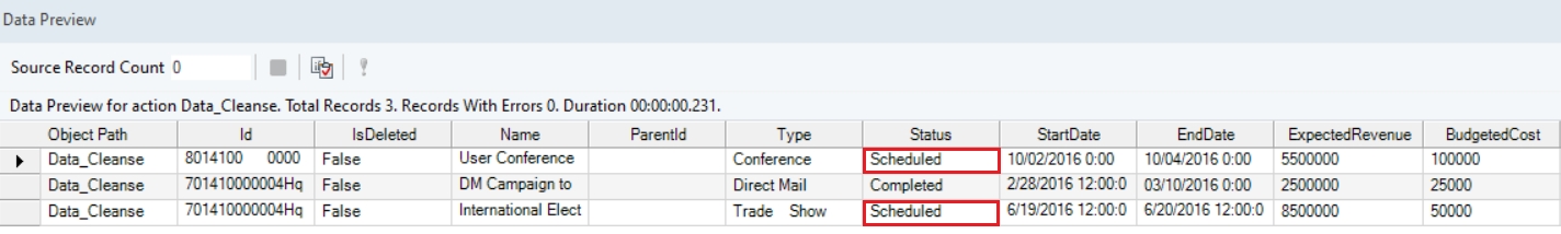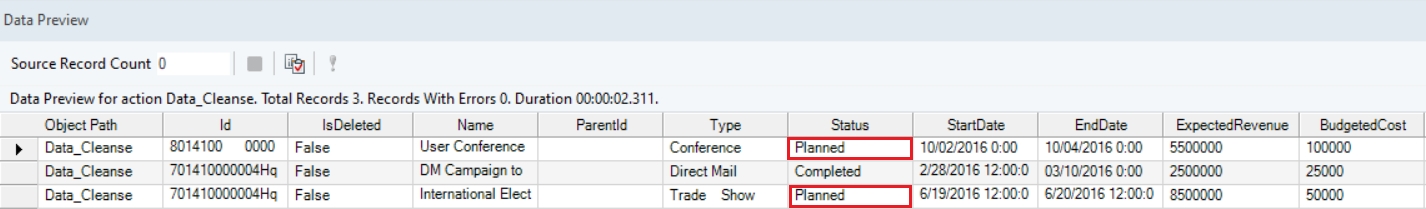 Now, if we look at the output, we can see that the Data Cleanse Transformation Object has found and replaced the status values from ‘Planned’ to ‘Scheduled.’