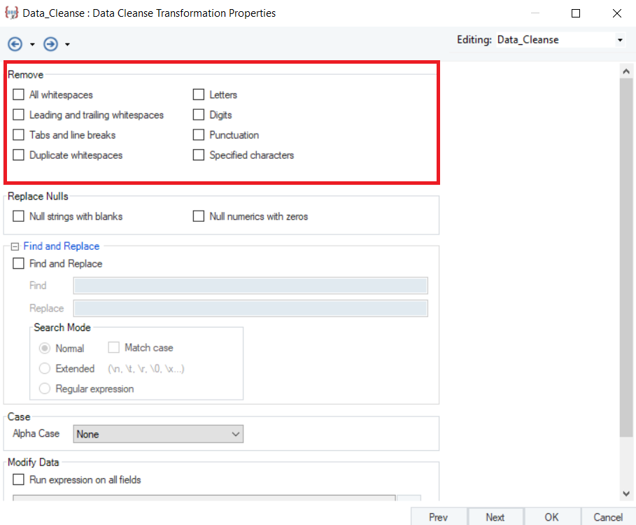 The options provided within this category allow you to remove values, spaces, tabs, and line breaks from your data. You can find the following options within this category:
