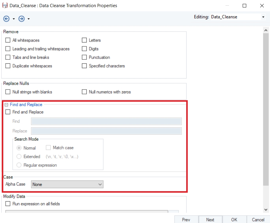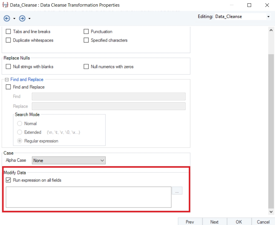 The Modify Data option provides you the flexibility and convenience of applying an expression to all fields in your data. Check the Run expression on all fields option to activate this feature.