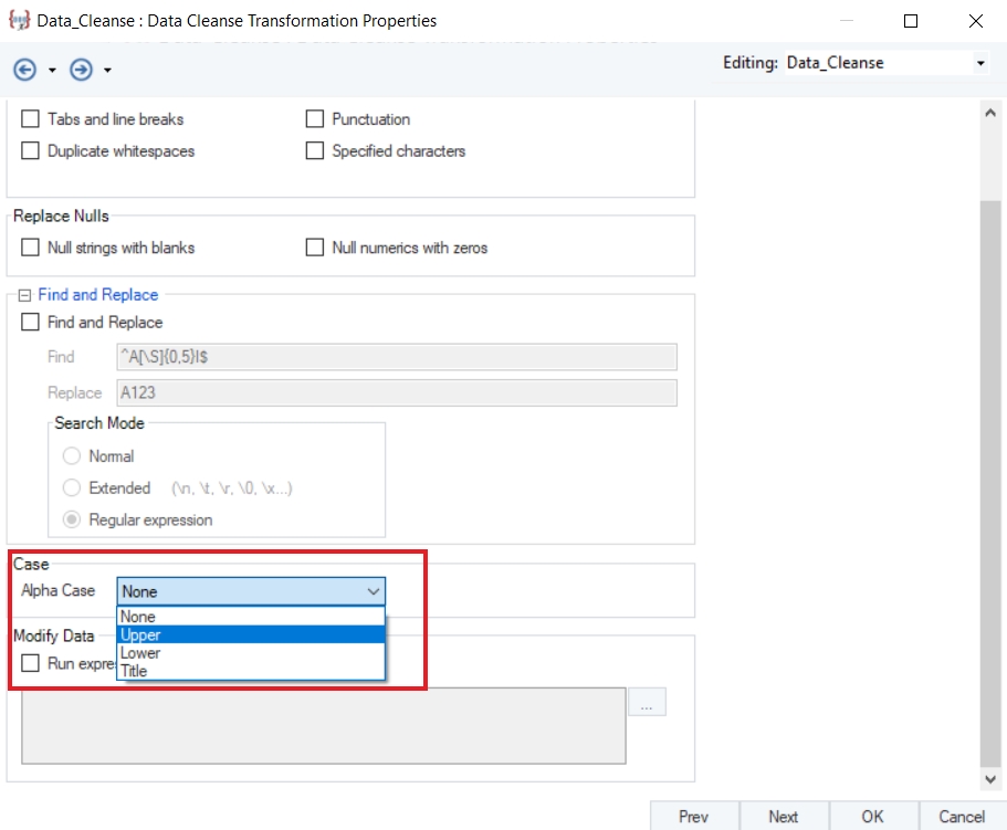 Case options allow users to convert the letter case of source data to Upper, Lower, or Title case.
