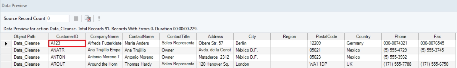 In the example below, we want to replace the “ALFKI” value(s) in the CustomerID field with “A1234”.