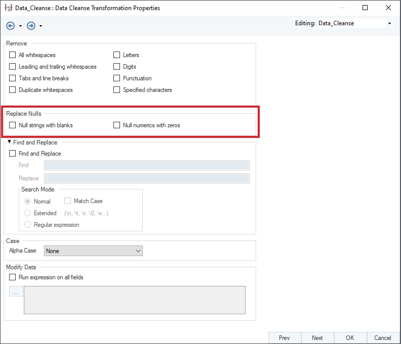 As the name suggests, the options within this category allow you to replace null values inside a string or numeric field with a corresponding value – blank in case of a string, and zero, in case of a numeric field.