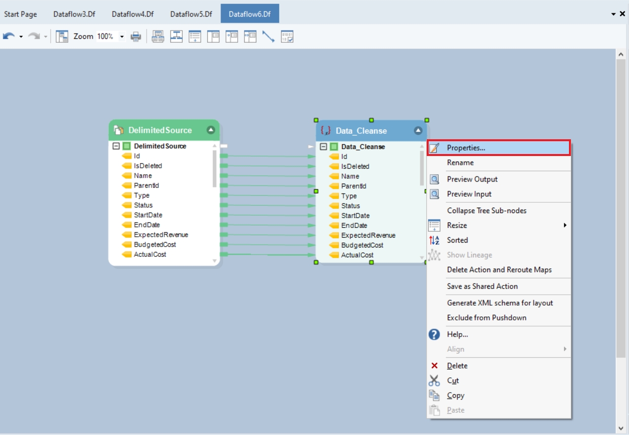 Now you have to specify the criteria for data cleansing. Right-click on the Data Cleanse Transformation object and select Properties from the context menu.