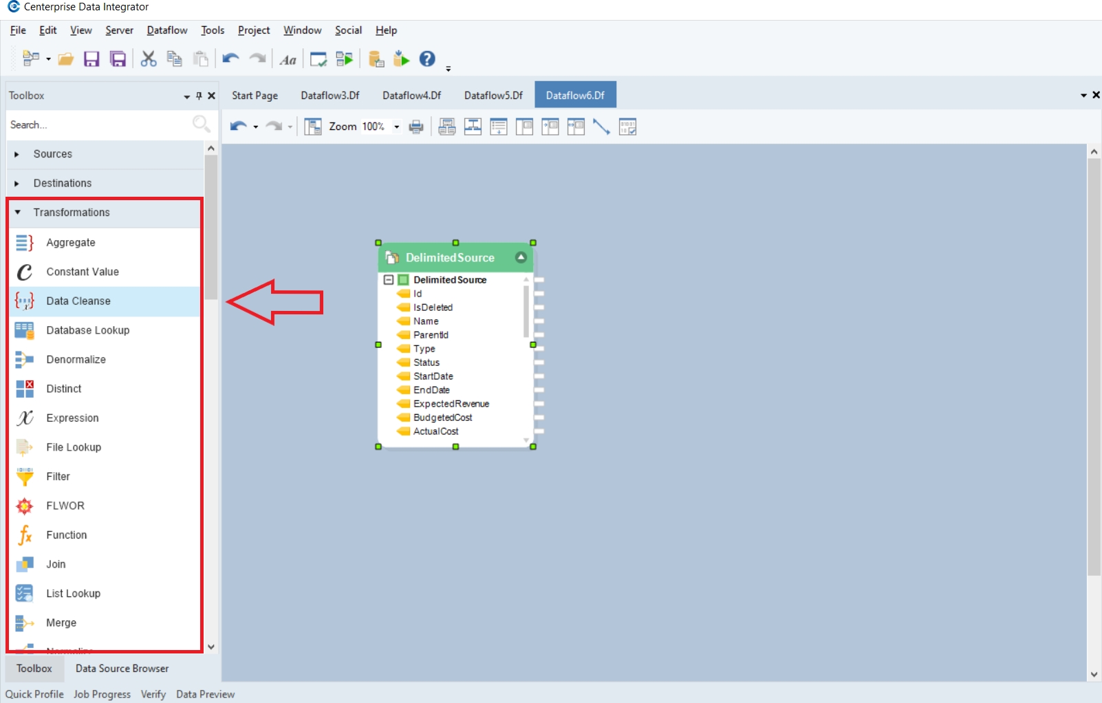 Now drag the Data Cleanse Transformation object from the Transformations section in the Toolbox and drop it onto the designer.