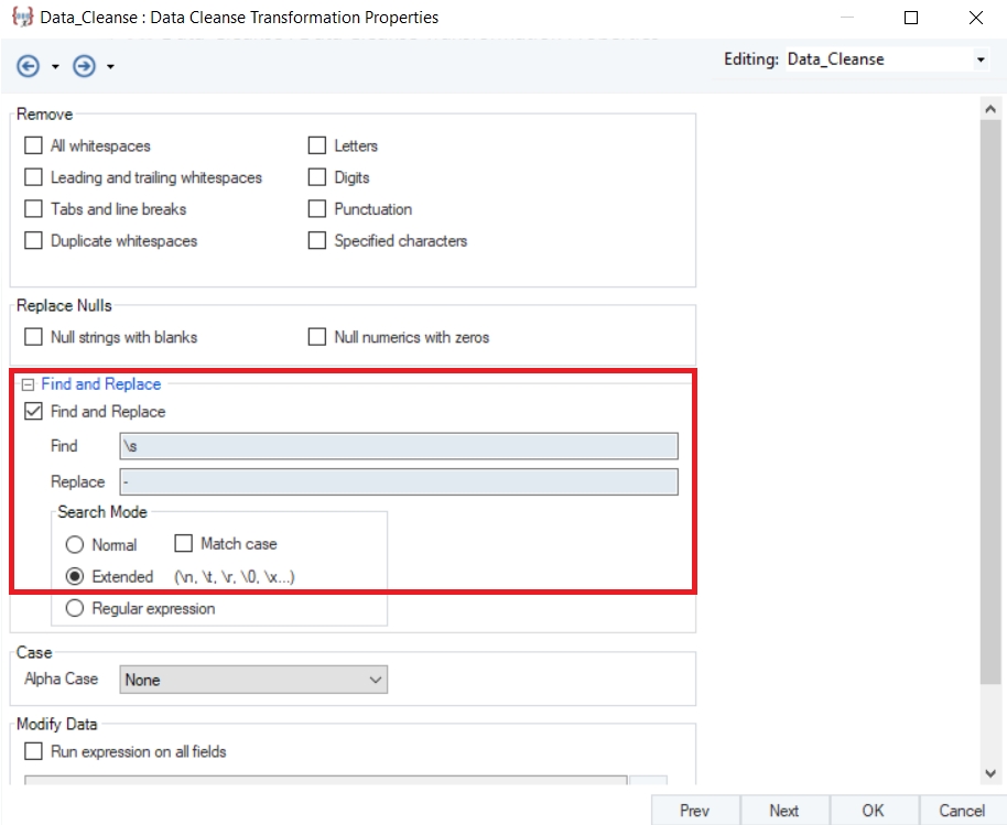The Find and Replace options enable users to replace a value in the source dataset with another value.