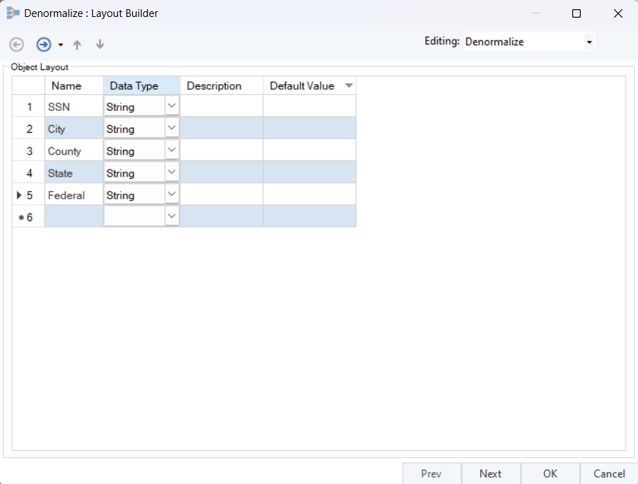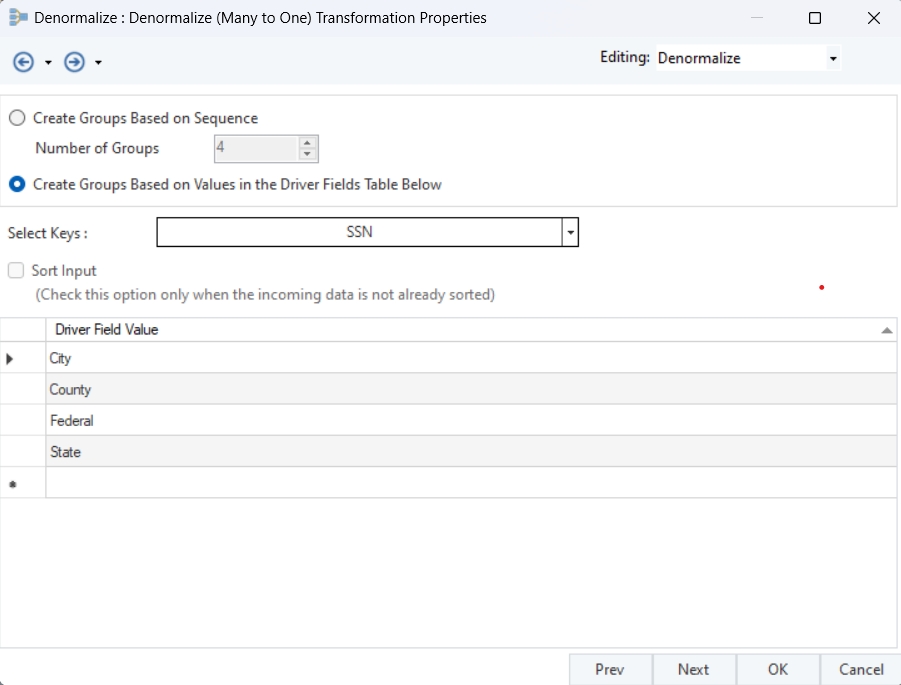 Driver Field Value: Enter the pivot values for your Denormalize transformation object. Using the example below, the pivot values would be City, State, Federal, and County.