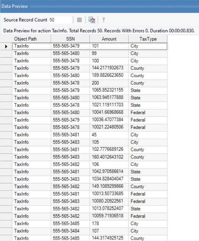 The TaxInfo source data contains information about TaxType (City Tax, County Tax, State Tax, and Federal Tax), Tax Amount, and SSN (Social Security Number) of taxpayers.
