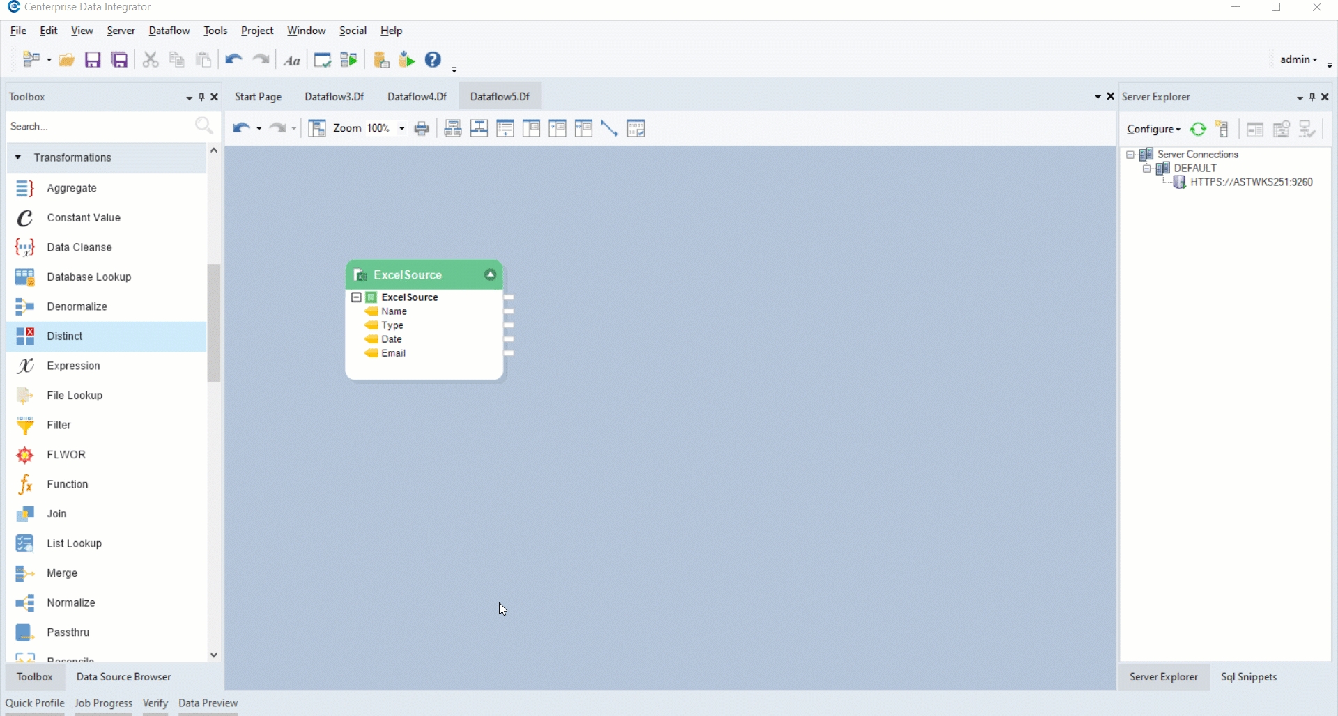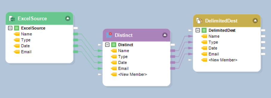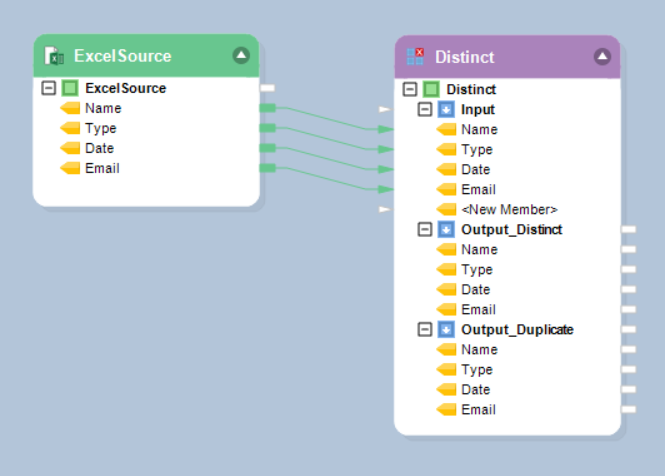 To apply the Distinct transformation to your source data, drag-and-drop the Distinct transformation object from the Transformations section in the Toolbox. Map the fields from the source object by dragging the top node of the ExcelSource and to the top node of the Distinct transformation object. To do this, go to Toolbox>Transformations>Distinct.
