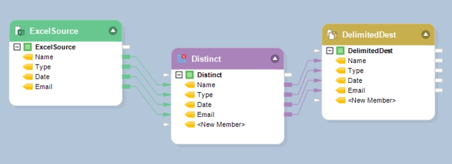 You can now write the Distinct output to a destination object. In this case, we will write our output into a Delimited destination object.