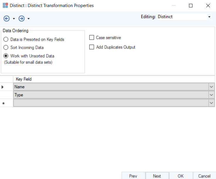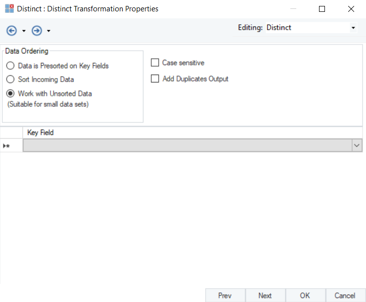 Work with Unsorted Data: When this option is selected, the Distinct transformation object will work with unsorted data.