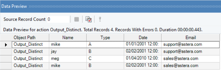 The Distinct transformation object in Astera removes duplicate records from the incoming dataset. You can use all fields in the layout to identify duplicate records, or specify a subset of fields, also called key fields, whose combination of values will be used to filter out duplicates.