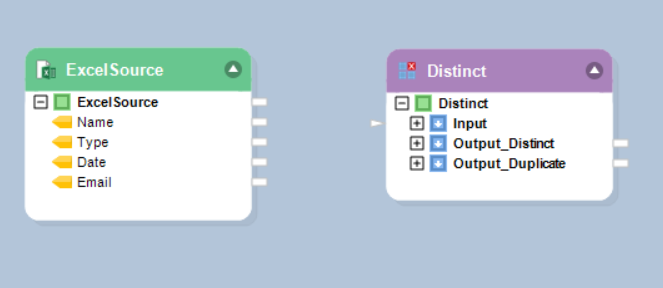Now, map the objects by dragging the top node of ExcelSource object to the Input node of the Distinct transformation object.
