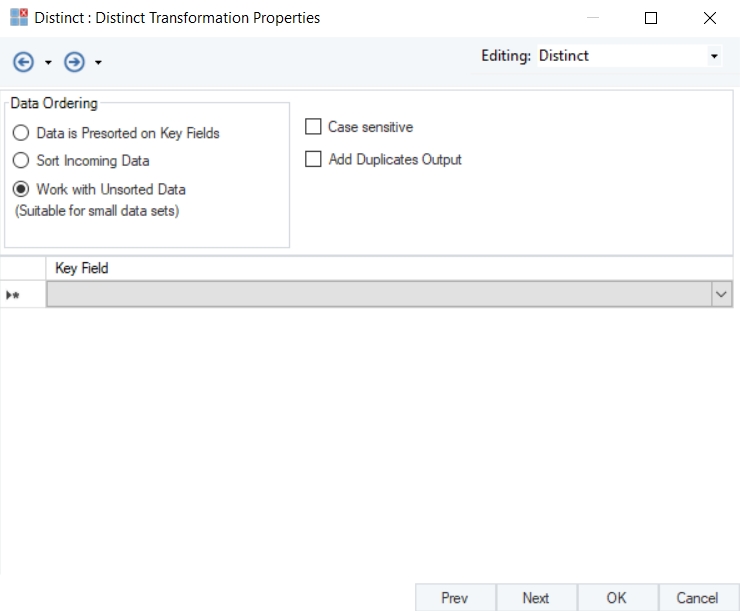 On this window, the distinct function can be applied on the fields containing duplicate records by adding them under Key Field.