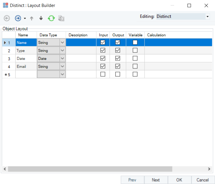 Now, right-click on the Distinct transformation object and select Properties. This will open the Layout Builder window where you can modify fields (add or remove fields) and the object layout.