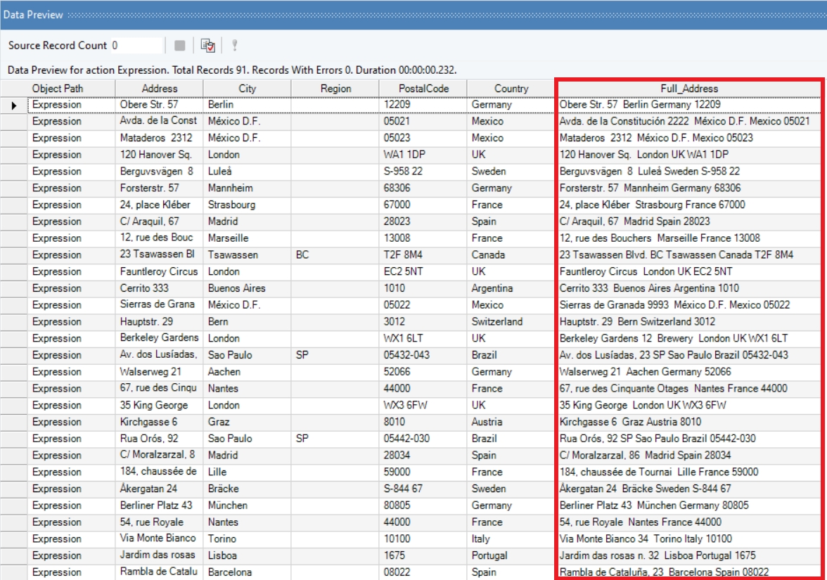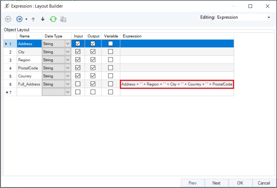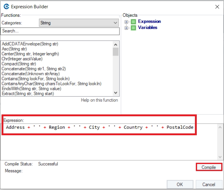 In this example, we can either use a concatenate function from the built-in functions or write an expression of our own to return the complete address information in a single field.